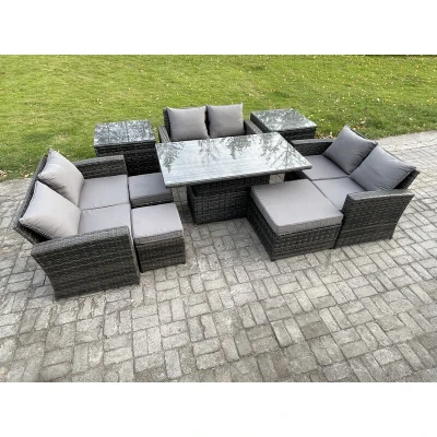 General description This outdoor garden furniture sofa set provides ample seating for up to 9 people. It includes a tempered glass coffee table, making it an ideal addition to your patio, garden, backyard, pool, and other indoor and outdoor spaces. Technical specifications 2 x Side coffee table size: 65L x 65W x 66H cm 1 x PC Rising dining table: 140L x 80W x 68/48H cm (height adjustable from 68 cm to 48 cm) 1 x Big footstool size: 65L x 65W x 34H cm 2 x Small fully assembled footstool size: 40L x 40W x 37H cm 3 x 2 Seater sofas size: 124L x 70W x 74H cm Material: Dark grey mixed rattan with dark grey fabric 5mm thickness transparent tempered glass with suckers on the surface to prevent sliding Installation Items come flat packed and are easy to assemble. Usage The table can be used as both a coffee table and a dining table. It features an 8 cm thick seat cushion and a soft pillow back cushion for added comfort. To maintain the furniture, keep the cushions indoors or use a rain cover