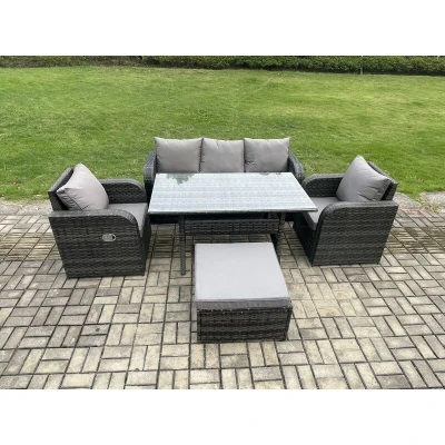 General description This deluxe 5-piece reclining rattan sofa set is a great addition to your patio or garden. Made of high-quality PE rattan and durable galvanized steel construction, it offers sturdiness and longevity, making it suitable for outdoor use all year round. This set is perfect for gathering with family and friends. Technical specifications Set Dimensions: 1 x Big footstool: 65L x 65W x 34H cm 2 x Reclining Chairs: 74L x 67W x 79H cm 1 x 3-seater Sofa: 177W x 67D x 79H cm 1 x Dining Table: 140L x 80W x 69H cm Color: Dark grey mixed rattan with dark grey fabric Seat Cushion Thickness: 8 cm Armrest Width: 9 cm Glass Thickness: 5 mm (clear tempered glass) Installation Items come flat packed and are easy to assemble. Sturdy galvanized steel tube metal frames with powder coating to prevent rust. Usage The two armchairs are adjustable, allowing you to change the inclination of the chair back from 90° to 130°. Low maintenance with removable cushion covers. Recommended to keep