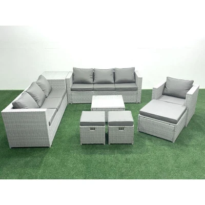 Fimous Wicker PE Rattan Sofa Garden Furniture Set with Armchair Square Coffee Table 3 Footstools Side Light Grey Mixed
