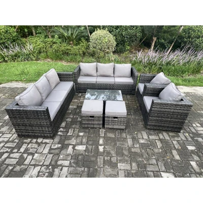 General description This outdoor garden furniture sofa set provides ample seating for up to 10 people, featuring a tempered glass coffee table ideal for holding food, drinks, and more. It is a perfect addition to your patio, garden, backyard, pool, and other indoor and outdoor spaces. Technical specifications Set Dimensions: 2 x Three Seater Sofa: 177W x 65D x 66H cm 2 x Chairs: 74W x 65D x 66H cm 1 x Oblong Table: 85L x 50W x 37H cm 2 x Fully assembled footstools: 40L x 40W x 34H cm Sofa Weight Capacity: 250kg Table Weight Capacity: 80kg Footstool Weight Capacity: 100kg Material: Dark grey mixed rattan with dark grey fabric Thickness of tempered glass: 5mm Installation Items come flat packed and are easy to assemble. Sturdy galvanized steel tube metal frames with powder coating to prevent rust. Usage Low maintenance with removable cushion covers. Keep cushions indoors or use a rain cover when not in use. Use a rain cover if the furniture is not used for an extended period. Other