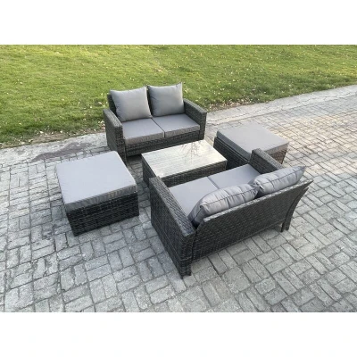 Fimous Wicker Rattan Garden Furniture Sofa Set with Rectangular Coffee Table Double Seat 2 Big Footstool 6 Seater Outdoor Dark Grey