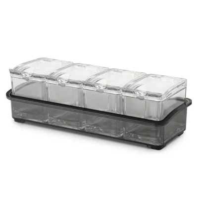 Perfect for home bars, parties, or professional use, the Final Touch Garnish Server offers a clean and convenient way to store and serve garnishes and toppings for drinks, salads, burgers and more. With four removable containers and a non-slip base, this compact caddy keeps everything from cherries and olives to lemon wedges and lime slices neatly arranged and easy to access, as well as portable for picnic baskets and on-the-go snacks.Whether you're mixing drinks for guests or prepping a casual gathering, the Final Touch Garnish Server adds efficiency and style to your setup. It’s a simple solution for keeping ingredients tidy, fresh, and within reach.Made from clear plastic with non-slip base.Dimensions: 8.7(H) x 26.5(W) x 10.5(D) cm.Dishwasher safe.