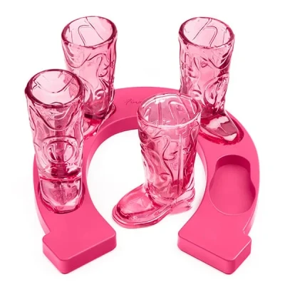 AmazonPretty and tough pink boot shot glasses made from thick, clear glass and featuring charming Western details. Lightweight pink horseshoe tray with non-slip feet to keep things steady. Bring the fun to girls night, birthdays, bachelorettes, or any pink-themed bash. Pairs perfectly with tequila, whiskey, or your party favourites. Includes: 4 pink boot shot glasses with pink horseshoe serving tray. | Dimensions: boot shots: 2.3" W x 1.5" D x 3.1" H (5.8 cm W x 3.8 cm D x 8 cm H) horseshoe tray: 6.1" W x 7.1" D x 0.5" H (15.5 cm W x 18 cm D x 1.2 cm H) | Capacity: 1 ounce (30 milliliter) | Material: glass & plastic (bpa-free) | Washing: hand wash, Manufacturer: Product Specialties Inc.