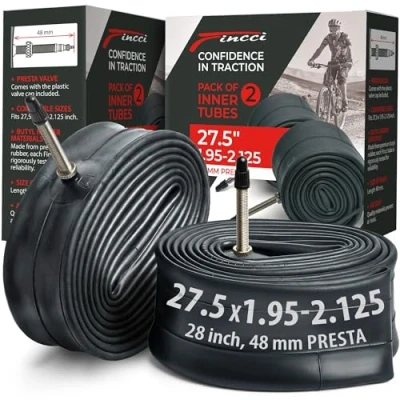 Universal Compatibility: Designed for tyres sized 27.5 x 1.95 to 27.5 x 2.1 inches, making these 27.5 inner tube suitable for mountain, hybrid, and electric bikes across various terrains, with consistent fit and stable air pressure during regular riding. Lightweight & Durable: Each 27.5 inner tube weighs 220 grams and is made from premium butyl rubber, supporting reliable air retention, durability, and dependable performance for daily use and off-road cycling. Includes plastic caps Enhanced Valve Technology: Features a 48mm Presta Valve, FV, French Type Valve with a reinforced base, creating a secure seal to support steady tire inflation, reduce air loss, and allow hassle-free pumping with standard pumps. Trusted UK Brand – Fincci offers full after-sales support and a manufacturer warranty, with products undergoing dual quality control: raw material testing and finished item inspection. Effortless Installation: Flexible yet robust materials allow smooth mounting and a snug fit, helping minimize pinching risk and simplifying installation even on wider tyres.