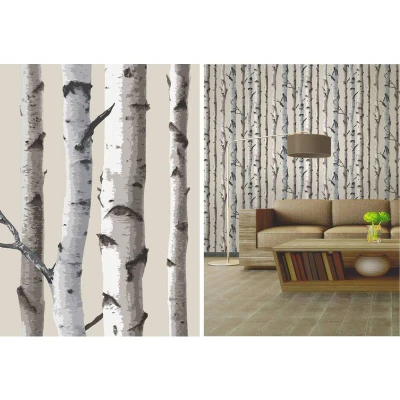 General description This striking wallpaper design features a captivating portrayal of natural birch trees, creating an immersive and serene woodland ambiance. The pattern showcases numerous slender tree trunks, extending vertically, with their characteristic white and grey bark textures beautifully depicted. The varying shades of grey and white within the bark mimic the authentic appearance of birch trees, providing a realistic and visually engaging effect. Delicate hints of darker branches subtly emerge from the trunks, adding further depth and detail to the arboreal scene. The background is a soft, muted beige or light taupe, allowing the natural beauty of the birch trees to stand out prominently without overwhelming the space. The overall impression is one of tranquility and connection to nature, bringing the peaceful feeling of a birch forest directly into your home. This design is perfect for creating a feature wall in a living room, adding a calming and contemporary touch to a