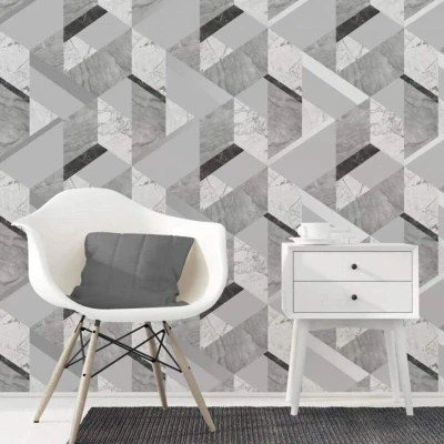 General description Grey, black and metallic silver ‘Marblesque Geometric’ wallpaper, new from Fine Décor. Technical specifications Roll size: 10.05m x 0.53m Pattern repeat: 53cm Usage Paste the paper Washable Peelable Good colour fastness Flat smooth texture