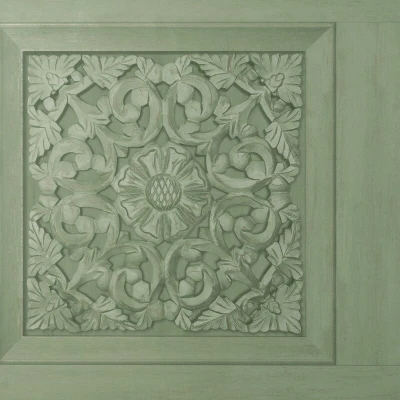 WallpaperDirectA realistic faux panel design with an intricate floral pattern seemingly carved into square frames. Shown here in the Sage Green colourway.