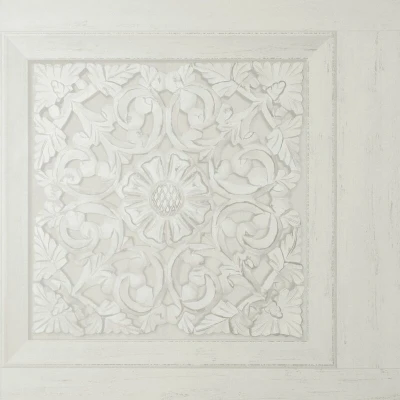 WallpaperDirectA realistic faux panel design with an intricate floral pattern seemingly carved into square frames. Shown here in the Stone Grey colourway.