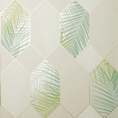 WallpaperDirectBring glamorous and contemporary style to your walls with this modern geometric design, featuring metallic details and palm leaf effect. Seen here in the Natural / Green colourway.