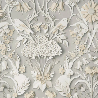 WallpaperDirectA modern twist on a traditional damask style design, featuring delicately detailed woodland trees and animals. Seen here in the Soft Grey colourway.