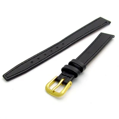 Fine Stitched Calf Leather Watch Strap Band with Pins 14mm Black Gilt (Gold Colour) Buckle R622/14