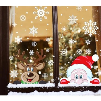 FINGOOO Christmas Window Stickers, 6 Sheets Peeping Santa and Rudolph Clings Snowflake Decal for Xmas Decoration