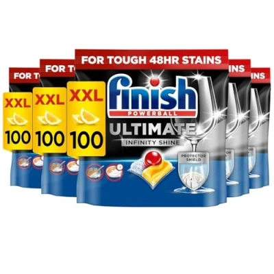 POWERFUL CLEANING – Finish Ultimate Infinity Shine Dishwasher Tablets effectively break down tough food residue, grease, and stains, ensuring a deep clean for dishes, glassware, and cookware. ADVANCED SHINE TECHNOLOGY – Formulated to enhance the shine of glassware and silverware, these tablets help prevent water spots and dullness for a sparkling finish. GREASE AND ODOR CONTROL – Designed to cut through stubborn grease while eliminating odors, leaving your dishwasher and dishes smelling fresh with a clean lemon scent. ALL-IN-ONE PERFORMANCE – Combines detergent, rinse aid, and shine booster in one tablet, simplifying dishwashing by eliminating the need for separate products. BULK SUPPLY – With 100 tablets per pack, this long-lasting supply ensures convenience and efficiency, reducing the frequency of repurchasing and maintaining optimal cleaning performance.