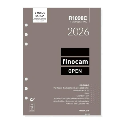 DURATION: January 2026 - December 2026 (12 months) INTERIOR: 1 Day Page. Ample writing space for every day. With hours from 8:00h to 22:00h. Article language: Catalan. With information about the holidays of Catalonia. CONTENTS: Drop-down annual plan, fixed annual planning, schedule, calendars, annuity and 2 additional months Fortnight View. MATERIAL: Paper - 70 g/m². Finocam items are designed to optimize your personal organization, making your life more convenient, and at the same time more beautiful.