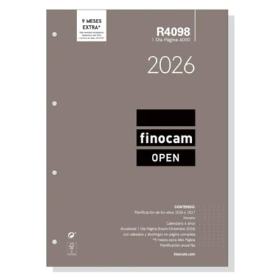 DURATION: January 2026 - December 2026 (12 months) INTERIOR: 1 Day Page. Ample writing space for every day. With quarters of hours from 8:00h to 20:00h. Saturday and Sunday in full page. Article language: Spanish. With information about Spanish holidays. CONTENTS: Annual plan, fixed annual planning, schedule, calendars, annuity and supplementary months. MATERIAL: Paper - 70 g/m². Finocam items are designed to optimize your personal organization, making your life more convenient, and at the same time more beautiful.