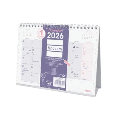 DURATION: January 2026 - December 2026 (12 months) INTERIOR: Month View. To plan on a monthly level. Article language: Catalan. With information about the holidays of Catalonia. CONTENTS: The annuity of the calendar contains: name, national holidays, CC holidays, AA., marked days, moon phases and seasonal changes. Inside front: current month for writing. Inside back: yearly calendar. It has other extra content: annual calendar of the following year, annual planning, list of holidays of the CC AA. and the provincial capitals and the beginnings of the Chinese, Muslim, Orthodox and Hebrew New Years. MATERIAL: Metal double spiral and paper 120g/m². Finocam items are designed to optimize your personal organization, making your life more convenient, and at the same time more beautiful.