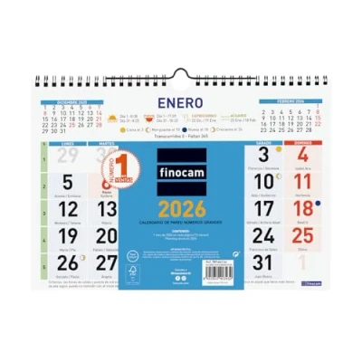 DURATION: January 2026 - December 2026 (12 months) INTERIOR: Month View. To plan on a monthly level. Article language: Spanish. With information about Spanish holidays. CONTENTS: The annuity of the calendar contains: names, national holidays, CC holidays, AA., moon phases, sunrise and sunset times, zodiac signs, elapsed days and days to pass, seasonal changes and sun/lunar eclipses. Other extra content: annual planning and list of holidays of the provincial capitals. MATERIAL: Metal double spiral and paper 120g/m². Finocam items are designed to optimize your personal organization, making your life more convenient, and at the same time more beautiful.
