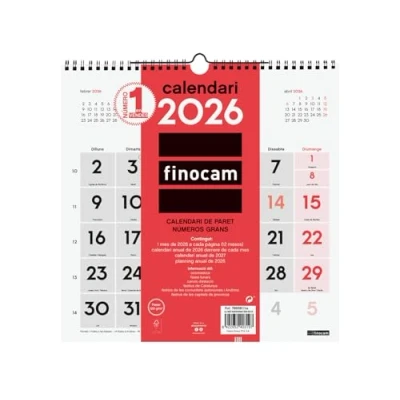 DURATION: January 2026 - December 2026 (12 months) INTERIOR: Month View. To plan on a monthly level. Article language: Catalan. With information about the holidays of Catalonia. CONTENTS: The annuity of the calendar includes information regarding international holidays, moon phases and seasonal changes. The calendar has extra content: reduced calendars from September to December of the previous year, annual planning, schedule template, annual calendar for the year and the following year, list of international holidays and country codes. MATERIAL: Metal double spiral and paper 120g/m². Finocam items are designed to optimize your personal organization, making your life more convenient, and at the same time more beautiful.