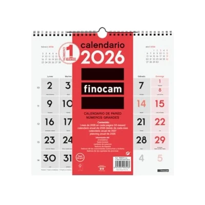 DURATION: January 2026 - December 2026 (12 months) INTERIOR: Month View. To plan on a monthly level. Article language: Spanish. With information about Spanish holidays. CONTENTS: The annuity of the calendar includes information regarding international holidays, moon phases and seasonal changes. The calendar has extra content: reduced calendars from September to December of the previous year, annual planning, schedule template, annual calendar for the year and the following year, list of international holidays and country codes. MATERIAL: Metal double spiral and paper 120g/m². Finocam items are designed to optimize your personal organization, making your life more convenient, and at the same time more beautiful.