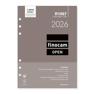 DURATION: January 2026 - December 2026 (12 months) INTERIOR: 2 Days Page. Writing range for each day. With space to specify schedule. Article language: Spanish. With information about Spanish holidays. CONTENTS: Annual drop-down plan, fixed annual planning, schedule, calendars, annuity and 2 additional months Fortnight View. MATERIAL: Paper - 80 g/m². Finocam items are designed to optimize your personal organization, making your life more convenient, and at the same time more beautiful.
