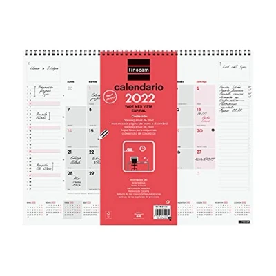 Duration of the year: January 2022 - December 2022 (12 months) Interior: Month Vista. For monthly planning. With space for notes. Box contents: The annuality of the mat includes information relating to: durations, notable days, national holidays, DC holidays, AA., marked days, moon phases and change of seasons. The mat also has other extra content: year and following year plan, list of holidays of CC AA. Capitals of Province and early Chinese New Years, Muslim, Orthodox and Hebrew. With information from the holidays of Spain. Large format 420 x 310 mm, similar to DIN A3. Material: paper and metallic double spiral. 150gsm FSC paper. Further details of this item can be found in the product description. Finocam items are designed to optimize your personal organization, making your life more convenient, convenient and at the same time more beautiful. You are purchasing Finocam quality products.