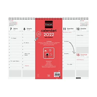 Duration of the year: January 2022 - December 2022 (12 months) Interior:Weekly View Vertical Full week overview vertically. Hours Box contents: The annuality of the mat includes information relating to: durations, notable days, national holidays, DC holidays, AA., marked days, moon phases, elapsed days and change of seasons. The mat also has other extra content: annual plan, list of holidays of CC AA. and the capitals of province and early Chinese New Years, Muslim, Orthodox and Hebrew. Information from Catalonia holidays Large format 420 x 310 mm, similar to DIN A3. Material: paper and metallic double spiral. 90gsm paper FSC certified Further details of this item can be found in the product description. Finocam items are designed to optimize your personal organization, making your life more convenient, convenient and at the same time more beautiful. You are purchasing Finocam quality products.