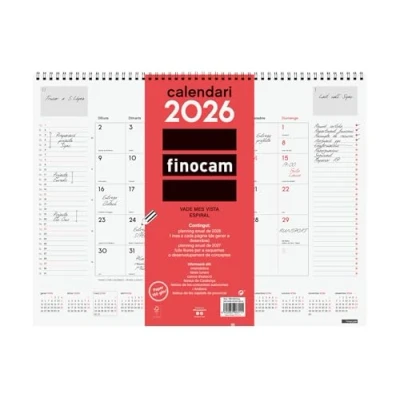DURATION: January 2026 - December 2026 (12 months) INTERIOR: Month View. To plan on a monthly level. With space for notes. Article language: Catalan. With information about the holidays of Catalonia. CONTENTS: The annuity of the vade includes information relating to: name, designated days, national holidays, CC holidays, AA., designated days, moon phases and changes of season. The vade also has other extra content: annual plan for the year and the following year, list of holidays of the CC and the provincial capitals and the beginnings of the Chinese, Muslim, Orthodox and Hebrew New Years. MATERIAL: Metal double spiral and paper 150g/m². Finocam items are designed to optimize your personal organization, making your life more convenient, and at the same time more beautiful.