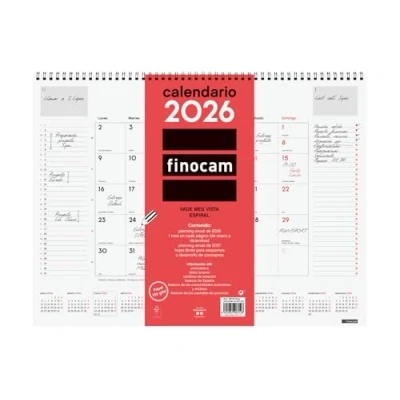 DURATION: January 2026 - December 2026 (12 months) INTERIOR: Month View. To plan on a monthly level. With space for notes. Article language: Spanish. With information about Spanish holidays. CONTENTS: The annuity of the vade includes information relating to: name, designated days, national holidays, CC holidays, AA., designated days, moon phases and changes of season. The vade also has other extra content: annual plan for the year and the following year, list of holidays of the CC and the provincial capitals and the beginnings of the Chinese, Muslim, Orthodox and Hebrew New Years. MATERIAL: Metal double spiral and paper 150g/m². Finocam items are designed to optimize your personal organization, making your life more convenient, and at the same time more beautiful.