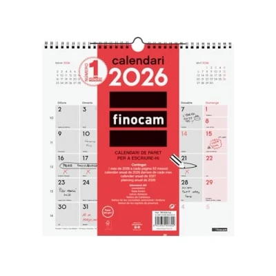 DURATION: January 2026 - December 2026 (12 months) INTERIOR: Month View. To plan on a monthly level. Article language: Catalan. With information about the holidays of Catalonia. CONTENTS: The annuity of the calendar includes information regarding international holidays, moon phases and seasonal changes. The calendar has extra content: reduced calendars from September to December of the previous year, annual planning, schedule template, annual calendar for the year and the following year, list of international holidays and country codes. MATERIAL: Metal double spiral and paper 120g/m². Finocam items are designed to optimize your personal organization, making your life more convenient, and at the same time more beautiful.