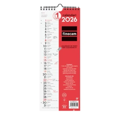 DURATION: January 2026 - December 2026 (12 months) INTERIOR: Month View. To plan on a monthly level. Article language: Catalan. With information about the holidays of Catalonia. CONTENTS: The annuity of the calendar includes information regarding international holidays, moon phases and seasonal changes. The calendar has extra content: reduced calendars from September to December of the previous year, annual planning, schedule template, annual calendar for the year and the following year, list of international holidays and country codes. MATERIAL: Metal double spiral and paper 120g/m². Finocam items are designed to optimize your personal organization, making your life more convenient, and at the same time more beautiful.