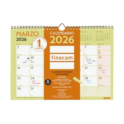DURATION: January 2026 - December 2026 (12 months) + Sep.-Dec. 2025 (4 months) reduced INTERIOR: Month View. To plan on a monthly level. Article language: Spanish. With information about Spanish holidays. CONTENTS: The annuity of the calendar includes information relating to: name, national holidays, CC holidays AA., marked days, moon phases and seasonal changes. Behind the page of each month you can consult the annual calendar. The calendar also has other extra content: reduced calendars from September to December of the previous year, annual calendar of the year and the following year, annual planning, list of holidays of the CC and provincial capitals and the beginning of the Chinese, Muslim, Orthodox and Hebrew New Years. MATERIAL: Metal double spiral and paper 120g/m². Finocam items are designed to optimize your personal organization, making your life more convenient, and at the same time more beautiful.