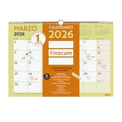 DURATION: January 2026 - December 2026 (12 months) + Sep.-Dec. 2025 (4 months) reduced INTERIOR: Month View. To plan on a monthly level. Article language: Spanish. With information about Spanish holidays. CONTENTS: The annuity of the calendar includes information relating to: name, national holidays, CC holidays AA., marked days, moon phases and seasonal changes. Behind the page of each month you can consult the annual calendar. The calendar also has other extra content: reduced calendars from September to December of the previous year, annual calendar of the year and the following year, annual planning, list of holidays of the CC and provincial capitals and the beginning of the Chinese, Muslim, Orthodox and Hebrew New Years. MATERIAL: Metal double spiral and paper 120g/m². Finocam items are designed to optimize your personal organization, making your life more convenient, and at the same time more beautiful.