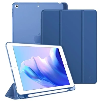 Compatible with iPad 6th Generation (2018, Model: A1893/A1954), compatible with iPad 5th Generation (2017, Model: A1822/A1823). With precise cut-outs and openings for easy access to all tablet features. Slim, lightweight, durable PU leather and soft scratch-free microfiber interior front. And the translucent back cover specially treated with matte finish will proudly show off the icon. Automatically wakes or puts your device to sleep when the lid is opened and closed to maximize battery life. Cover contains flip capability to transform the case into a viewing stand and keyboard stand with ease. Built-in pencil holder, grab your Pencil effortlessly whenever you want,easily to carry your pencil with the device.