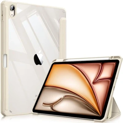 Exclusively designed for iPad Air 11-inch (M4) 2026 (Model: A3459/A3460/A3463 )iPad Air 11-inch (M3) 2025 (Model: A3266/A3267/A3270), iPad Air 11-inch (M2) 2024 (Model: A2902/A2903/A2904), iPad Air 5th Generation 10.9 Inch 2022 (Model: A2588/A2589/A2591), iPad Air 4th Generation 10.9 Inch 2020 (Model: A2072/A2316/A2324/A2325). Note: To verify your model, go to Settings -> General -> About -> Model Number. Or, check the back of your device to find a model like A2902. Hybrid Protection & Clear Personalization. Enjoy robust defense from drops and impacts with a durable hardshell back and flexible, shock-absorbing TPU bumper. A soft microfiber interior prevents screen scratches, while the crystal-clear transparent back proudly showcases the Apple logo, perfect for personalized stickers or photos. Seamlessly supports Apple Pencil Pro / Apple Pencil 2nd Gen magnetic and wireless charging when case is on. Tri-fold front cover has flip capability to transform the 11-inch iPad Air M5 case into a viewing stand and keyboard stand. Secure Pencil Holder & Wireless Charging. Never misplace your stylus again. The integrated holder keeps your Apple Pencil Pro firmly in place while supporting instant wireless attachment and charging. Perfectly designed for iPad Air 11" M4 (2026), M3 (2025), and M2 (2024). (Note: Pencil is NOT included). Seamless Installation & Auto Sleep/Wake. Features an easy clip-on design for a secure fit. The built-in magnetic strip instantly wakes your 11-inch iPad Air (2026) when opened and puts it to sleep when closed, preserving battery life. application. With built-in magnets, automatically wakes or puts your device to sleep when the lid is opened and closed.