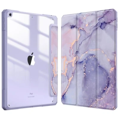 Fintie Hybrid Slim Case for iPad 9th / 8th 7th Generation (2021/2020 2019) 10.2 Inch [Built in Pencil Holder] Shockproof Cover with Clear Transparent Back Shell, Purple Marble