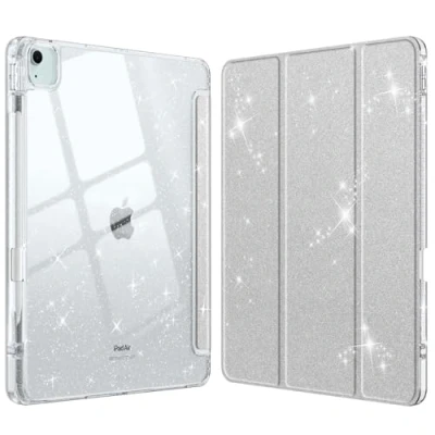 Fintie Hybrid Slim Case for iPad Air 13 inch (M3) 2025, (M2) 2024 [Built in Pencil Holder] Shockproof Cover with Clear Transparent Back Shell, Glittering Silver