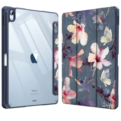 Fintie Slim Hybrid Case for iPad Air 11 inch M2 (2024), 5th Generation (2022) / 4th (2020) 10.9 Clear Back Cover and Pencil Holder, Hibiscus