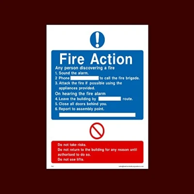 Fire Action any person Discovering a fire Plastic Sign with double sided fixing tape (FA3) - Fire, Assembly Point, Break Glass, Lift, Alarm, Extinguisher
