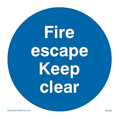 M001 : General mandatory action This sign is made from vinyl high tack A stickier sticker. Uses a stronger adhesive to make it more suitable for plastic surfaces like Wheelie Bins or where the sticker might get rubbed. S85 square Sign Text: Fire escape keep clear