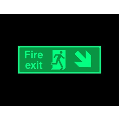 Fire exit diagonal Down right Safety sign 300mm x 100mm 1.2mm Photoluminescent rigid plastic with self adhesive backing