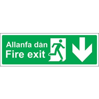 Fire exit down arrow Allanfa dan Welsh/English emergency safety sign Self adhesive sticker 300mm x 100mm