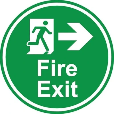Fire exit right arrow emergency floor sticker. Self adhesive floor graphic. Fitted with an anti slip heavy duty over-laminate to prevent slips. All signs come with a 5-year warranty. All our signs are UV resistant meaning they will not fade in sunlight.