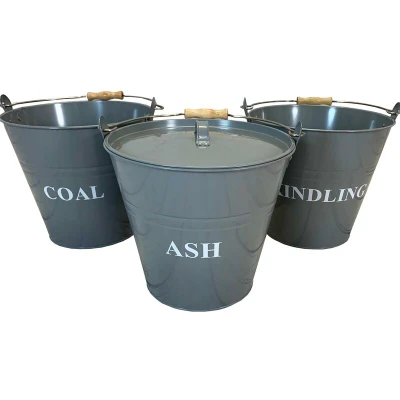 An all in one fireplace set, comprising ash, coal and kindling buckets in a beautiful French grey colour. This attractive fireplace accessory set features three essentials in a beautiful french grey finish. Each bucket features a sturdy metal handle with an ergonomic wooden grip and the ash bucket also has a metal lid. The lid of the ash bucket fits tightly to hide and contain untidy, discarded ash until you're ready to take it outside, and the coal and kindling buckets help make organising your fuel sources a breeze. Very handy if you have a wood burning stove or open fireplace * Carry handle with wooden grip for comfort * Sturdy metal handles on buckets * French grey finish