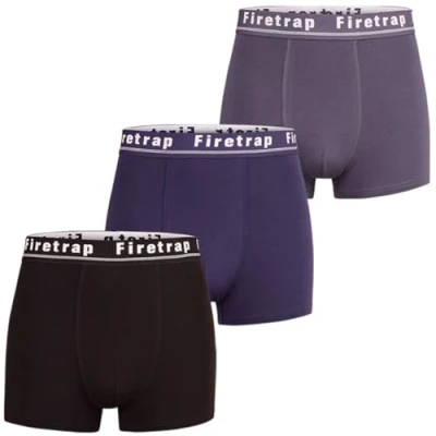 Comfortable and Stylish* FIRETRAP men's boxer shorts are crafted from a premium cotton blend, providing superior comfort and breathability for all-day wear. Our multipacks offer a variety of stylish designs and colors to suit your needs and match your style. Durable and Easy to Care For Made with high-quality materials, these boxer shorts are built to withstand regular use and washing, making them a smart, long-lasting choice for everyday wear. FIRETRAP underpants are easy to care for, simply machine wash and wear them repeatedly. 95% Cotton 5% Elastane, Machine Washable. Perfect Fit Designed to feel like a second skin, our boxer trunks offer a snug, supportive fit that prevents chafing or discomfort. With no riding up or digging in, they stay perfectly in place. Use our size guide to find your ideal fityou wont be disappointed. Great Value for Mone These FIRETRAP men's boxer multipacks offer excellent value, allowing you to stock up on high-quality cotton stretch boxers without overspending. Choose from packs of 3, 6, or 12, and get the styles you love at a price youll appreciate. Versatile for Any Occasion Whether you're lounging at home, working out, running errands, hanging out with friends, or sleeping, FIRETRAP stretch cotton boxer trunks provide unmatched comfort and freedom of movement without sacrificing style or quality. Don't miss outadd them to your cart before they sell out!