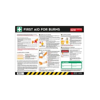 First Aid For Burns Safety Poster, Easy To Read Information Guide, Made From Anti Scuff Laminate PVC, W594mm x H420mm