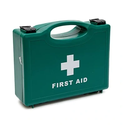 HSE Approved '1-10 PERSON' First aid kit in a touch green durable box This kit is now a minimum requirement first aid kit for ALL workplaces, and each kit is suitable for up to 10 persons. They are compliant with the health and safety executive (HSE) and the H&S First Aid Regs 1981 / Approved code of practise 1997 kit contains the following items - 1 x Tough Green Durable Box (Dims 20cm x 27cm x 9cm), 1 x Guidance Notes / Leaflet, 1 x Pair Of Gloves, 6 x Alcohol-Free Wipes, 20 x Assorted Washproof Plasters, 6 x Safety Pins, 4 x Triangular Bandages, 6 x HSE Medium Dressings, 2 x HSE Large Dressings, 2 x Eye pad Dressings