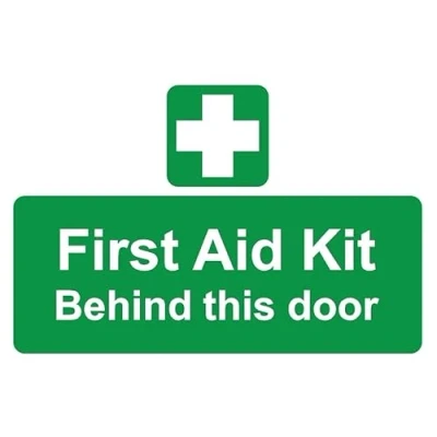 First aid kit behind this door safety sign Self adhesive sticker (200mm x 150mm)