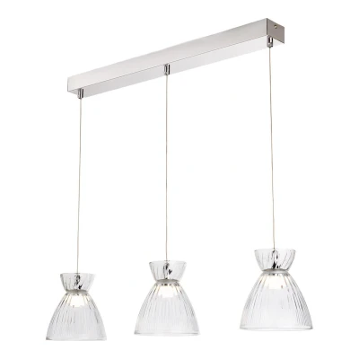 The Firstlight LED Royale 3-Light Bar Pendant is a stylish and highly functional fixture designed to provide focused, decorative lighting over wide surfaces. Featuring a linear bar in bright chrome metalware and three striking clear glass shades, this pendant is the perfect addition to modern kitchen islands, long breakfast bars, or dining tables. Its three-light configuration ensures balanced, ample illumination across the entire surface.Each of the three shades features a unique vertically lined decorative pattern within the clear glass. This subtle texture beautifully diffuses the light, adding depth and intrigue without disrupting the transparency of the glass. The fitting includes three integrated 3W LEDs (9W total), delivering 406 lumens of inviting 3000K warm white light, guaranteeing efficient, focused illumination. The maximum drop is 1200mm, allowing you to precisely adjust the height for optimal viewing and performance over your chosen surface. Being an integrated LED system, it includes a driver and comes with a reassuring 3-year guarantee.Choose the Royale 3-Light Pendant for a contemporary, energy-efficient lighting solution that delivers high-impact texture and functionality. Its combination of sleek chrome, subtle clear glass, and linear configuration ensures it will be a captivating and practical feature in any modern home. Shop now at SimplyLED to secure this premium decorative pendant and design a clear, contemporary lighting installation.