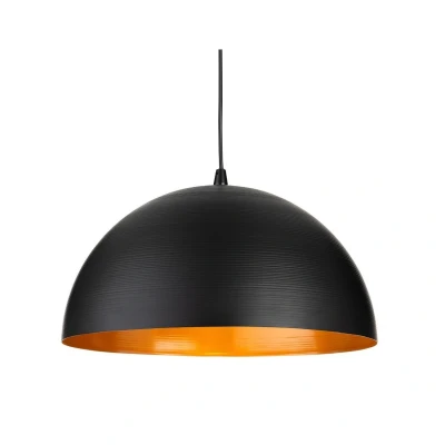 The Firstlight Moon 400mm Pendant Light is a unique and impactful large-scale fixture designed to be a contemporary focal point, perfect for illuminating large dining tables, spacious kitchen islands, or expansive living areas. This pendant features a bold and elegant contrast with a sleek matte black exterior and a stunning satin gold interior finish. Its generous 400mm diameter and gently curved dome shape are complemented by a fine detailed lined finish on both the outside and inside.The true elegance of the Moon pendant is revealed when illuminated. The satin gold colour lining the inside surface reflects the light, producing a wonderfully warm, satisfying light output that is ideal for creating an intimate and welcoming atmosphere. The fitting requires one standard E27 GLS bulb (maximum 40W, sold separately). To maximise the warm effect of the gold interior, we highly recommend using a high-quality, dimmable LED E27 bulb. The pendant offers an exceptionally long maximum drop of 2400mm, making it suitable for high ceilings and versatile installation.Choose the larger Moon Pendant Light for a commanding and sophisticated modern aesthetic with a warm heart. Its striking combination of matte black and satin gold creates a luxurious, industrial-chic statement piece designed for generous spaces. Shop now at SimplyLED to secure this unique fitting and select a high-performance E27 LED bulb to complete your show-stopping lighting design.Requires 1 x E27 GLS bulb max 40W (sold separately).