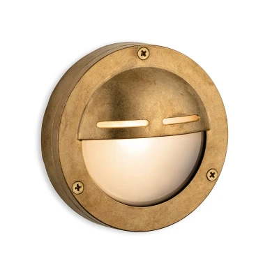 Step into the timeless charm of the Firstlight Nautic Traditional Style Eyelid Bulkhead in Brass with Frosted shade. This solid brass ship-style bulkhead, adorned with a frosted glass shade and a distinctive eyelid design, is more than just a lighting fixture; it's a testament to classic design, practicality, and enduring allure.The style and design of this outdoor bulkhead are a harmonious blend of attractiveness and practicality. The gleaming brass finish seamlessly combines with the frosted glass shade and the unique eyelid feature, creating a fixture that not only adds a touch of elegance to your space but also serves as a symbol of nautical charm.Crafted with precision by Firstlight Products, it boasts a solid brass construction that not only exudes durability but also adds a touch of luxury to your space. The frosted glass shade enhances the ambiance, creating a soft, inviting glow that transforms any setting into a haven of tranquility. The eyelid design adds a touch of character, casting a play of shadows that adds to the overall allure.Illuminate your world with the enchanting glow of this bulkhead. The frosted glass not only enhances the aesthetic appeal but also diffuses light in a way that adds warmth to your surroundings. The compact size, with a diameter of 140mm and a depth of 55mm, makes it a versatile choice for various spaces. The requirement of just 1 x G9 bulb with a maximum wattage of 20W ensures energy efficiency without compromising on brilliance.Installation is a breeze, adding to the user-friendly appeal of this traditional bulkhead. Let the allure of brass and frosted glass transform your space effortlessly. Bring home the Firstlight Nautic Traditional Style Bulkhead Eyelid and make a statement with every beam of light.Requires 1 x G9 bulb max 20W (sold separately).